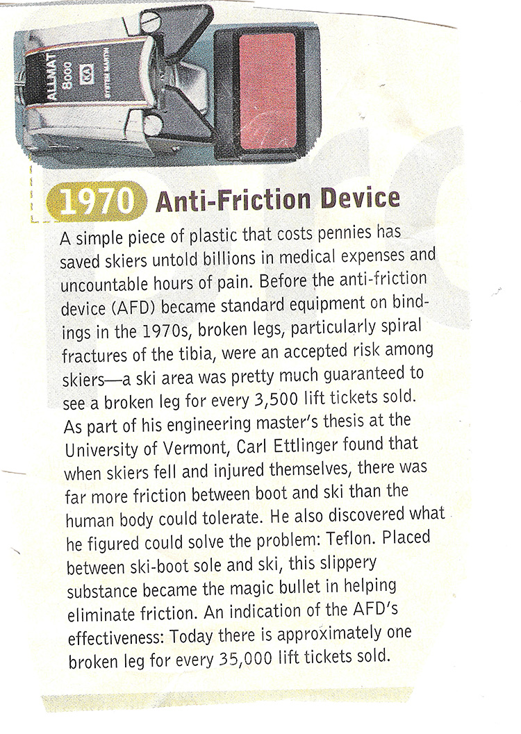 It’s possible to draw a direct line between Ettlinger’s Master’s thesis, “On the Prevention of Ski Injuries,” and the all-but-complete elimination of the sorts of tibial fractures that prevailed when the Sugarbush study began in 1971. Ettlinger’s research demonstrated that many ski injuries were due to excessive friction at the boot/binding interface, boot/binding incompatibility and improper release setting adjustment. Ettlinger almost immediately set about attacking each of these problems with his customary tenacity.