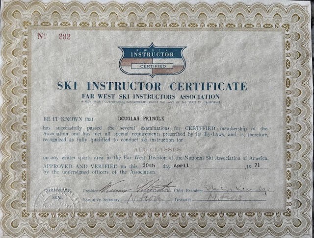 After struggling on snow the first day, he put together three turns without falling on the second day. That was enough for Winthers. He presented Pringle with a patch, told him he was a skier, and that he would have to start out as an apprentice instructor – shoveling snow and pulling out equipment – if he wanted to continue to ski for free.
