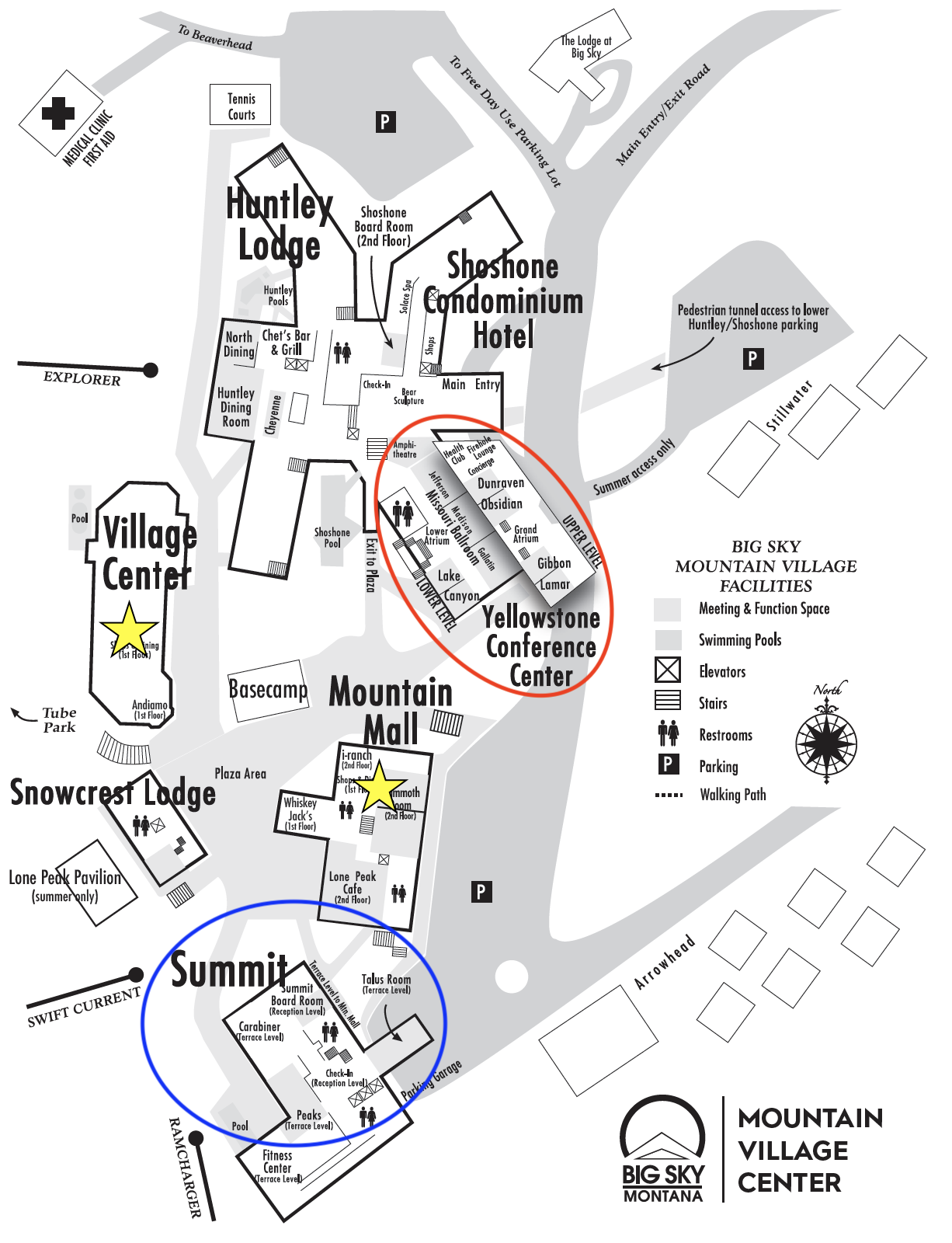 RED CIRCLE – Most large gatherings (dinners, awards, etc) will be held in the Missouri Ballroom. Breakout rooms will be in the Dunraven and Obsidian Rooms. The Shop will be in the Lake and Canyon Rooms.